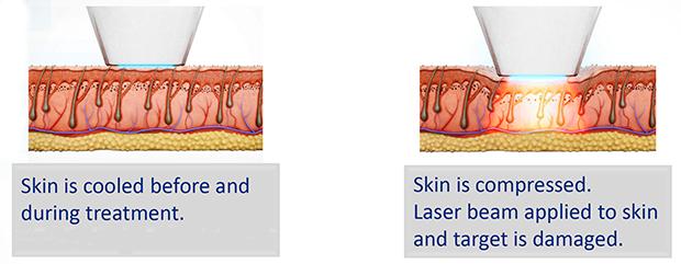 - Skin is compressed. Laser beam applied to skin and target is damaged